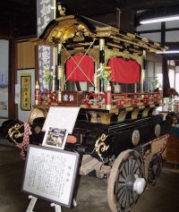 御輿車:蓮如上人の威徳を偲んで毎年四月二十三日から五月二日まで吉崎で蓮如忌が行われて上人の絵像が京都の本願寺から吉崎まではるばる五十三里(約二百八q)を信者の手によって往復しています。この蓮如忌道中は以前から細呂木のかごや(飯塚五右衛門氏)方で京都東本願寺の輿と吉崎別院用の輿と交替して、車は細呂木と吉崎の消防団の人々が引くことになっていました。また、両村では善男善女二百人余りが高張提灯をかかげ、近所の村々からも加わってにぎやかに送迎しています。この御輿は欅材で重さ三百s以上もあり、立派な黒の漆塗りで出来ています。この御輿は先の戦時中、人手不足のため現在はリヤカーに変わったと伝えています。 |