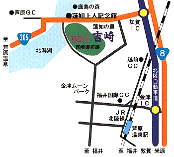 車の場合 ・北陸自動車道加賀インターより国道305号線を芦原方面へ約3キロ ・加賀温泉郷・芦原温泉から約15分 JRの場合 ・芦原温泉駅または加賀温泉駅よりタクシーで約15分 ・大聖寺駅より北陸鉄道バス塩屋行き吉崎下車