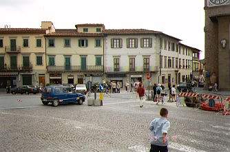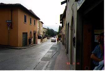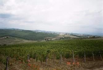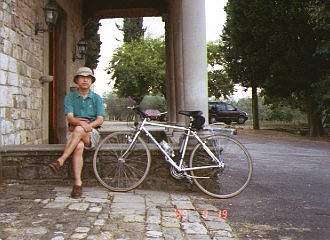海外の田園風景の中をのんびりサイクリングするのは以前から考えていたことだったが、フィレンツェ>トスカーナの中心地>郊外の田園>自転車の本場イタリアと連想して、急に思い立ちサイクリングをすることにした。 ありがたいものでWebで検索した結果レンタルサイクルショップと現地自転車好きの詳細なコースガイドを発見した。 3日ほどのツーリングを考えたが何せイタリアは初めてなものであれもこれも見なくてはならないと思ってしまい。結局一日だけの日帰りツーリングとなる。 バイクはレンタルショップで前日に確保、24Hで38,000リラ(約2,300円)コンディションは非常に良くアルミの車体に、シマノ21段変速。お店の人はハイブリッドと呼んでいた。タイヤはロードレーサーに近い。長期レンタルはもっと安くなるから料金は非常に良心的。受付のお姉さんは英語がうまい。 地図は適当なのがなかなかなく本屋を2、3軒廻ってようやく25,000分の1のものを手に入れた。 目指すはフィレンツェ南の田舎町「Impruneta」だ。ガイドでは222号線にのれとのことだがフィレンツェ郊外は道が交錯していてやはり迷ってしまう。 何とか人に尋ね222号線にのる。なだらかな起伏の道にキャンティワインを生み出すぶどう畑がどこまでも続く。